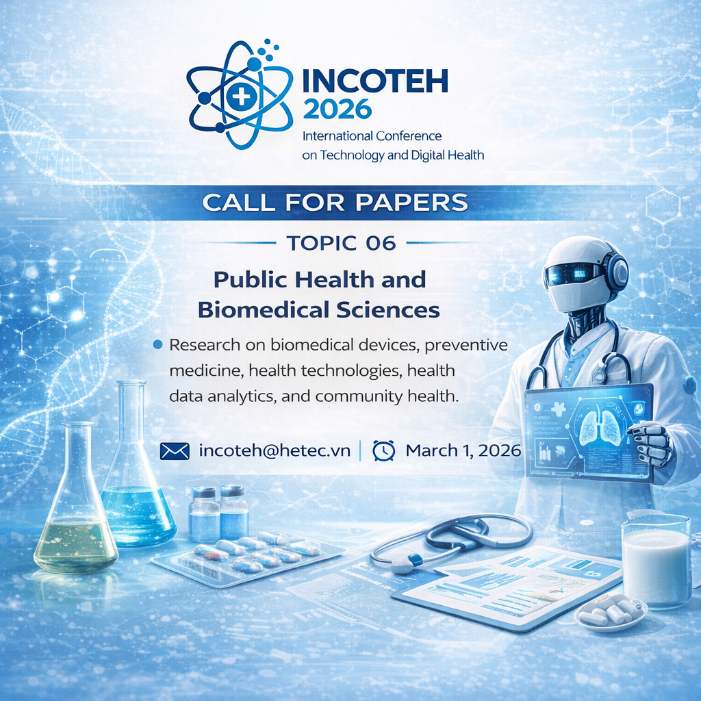 Ban Tổ chức trân trọng kính mời các nhà khoa học, giảng viên, chuyên gia y tế và cán bộ nghiên cứu quan tâm gửi bài báo khoa học tham gia Chủ đề 6 – Sức khỏe cộng đồng và khoa học y sinh, góp phần lan tỏa tri thức khoa học và giải pháp công nghệ phục vụ chăm sóc sức khỏe cộng đồng.